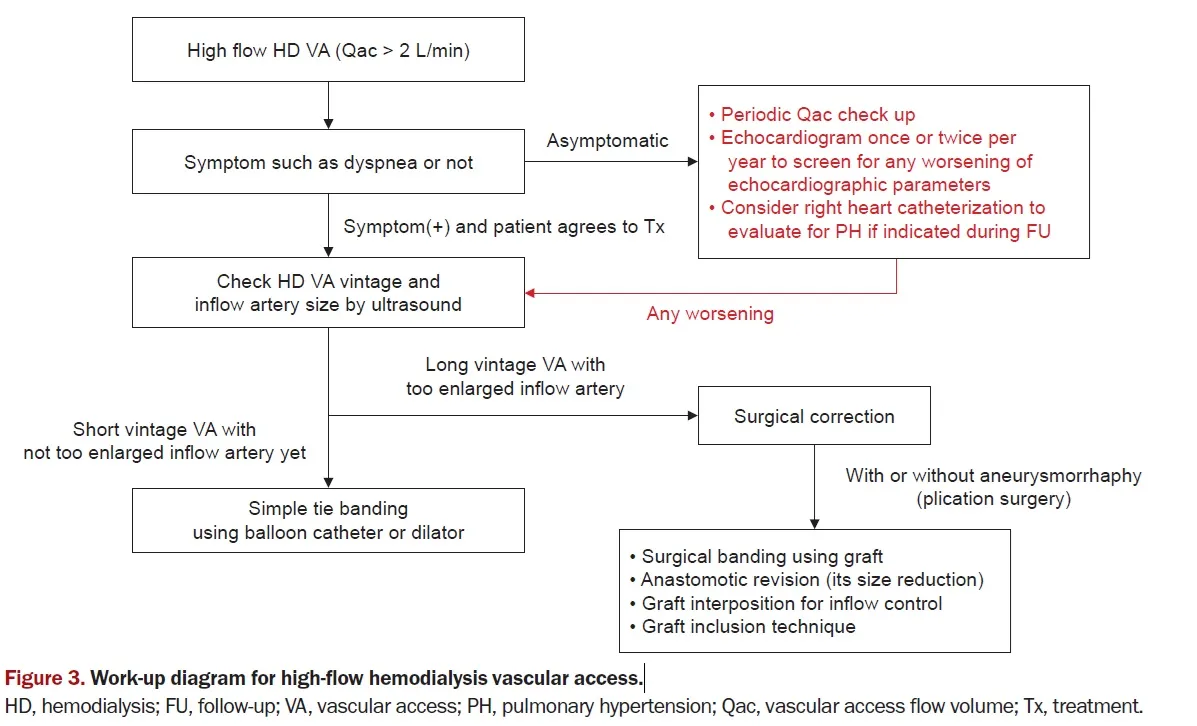 "Um ponto essencial para termos atenção são aqueles pacientes que evoluem com queixas congestivas de difícil manejo e uma FAV de alto débito, a monitorização deve ser cuidadosa para entender se a FAV de alto débito pode ser a causa da descompensação da IC, esses casos podem ser manejados com procedimentos da FAV (confere o fluxograma abaixo retirado desde artigo [link](https://krcp-ksn.org/journal/view.php?doi=10.23876/j.krcp.23.196))."