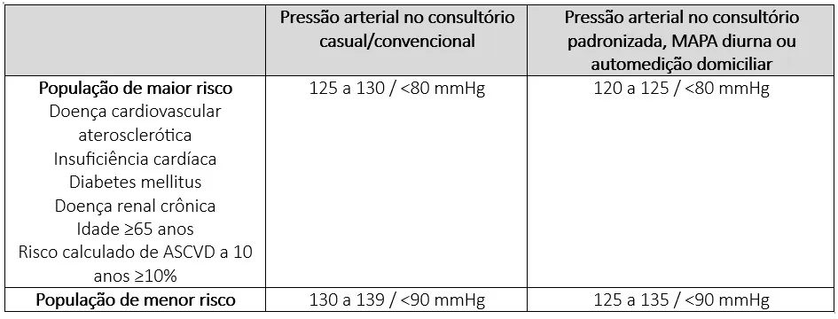 Meta de pressão arterial de acordo com o risco cardiovascular